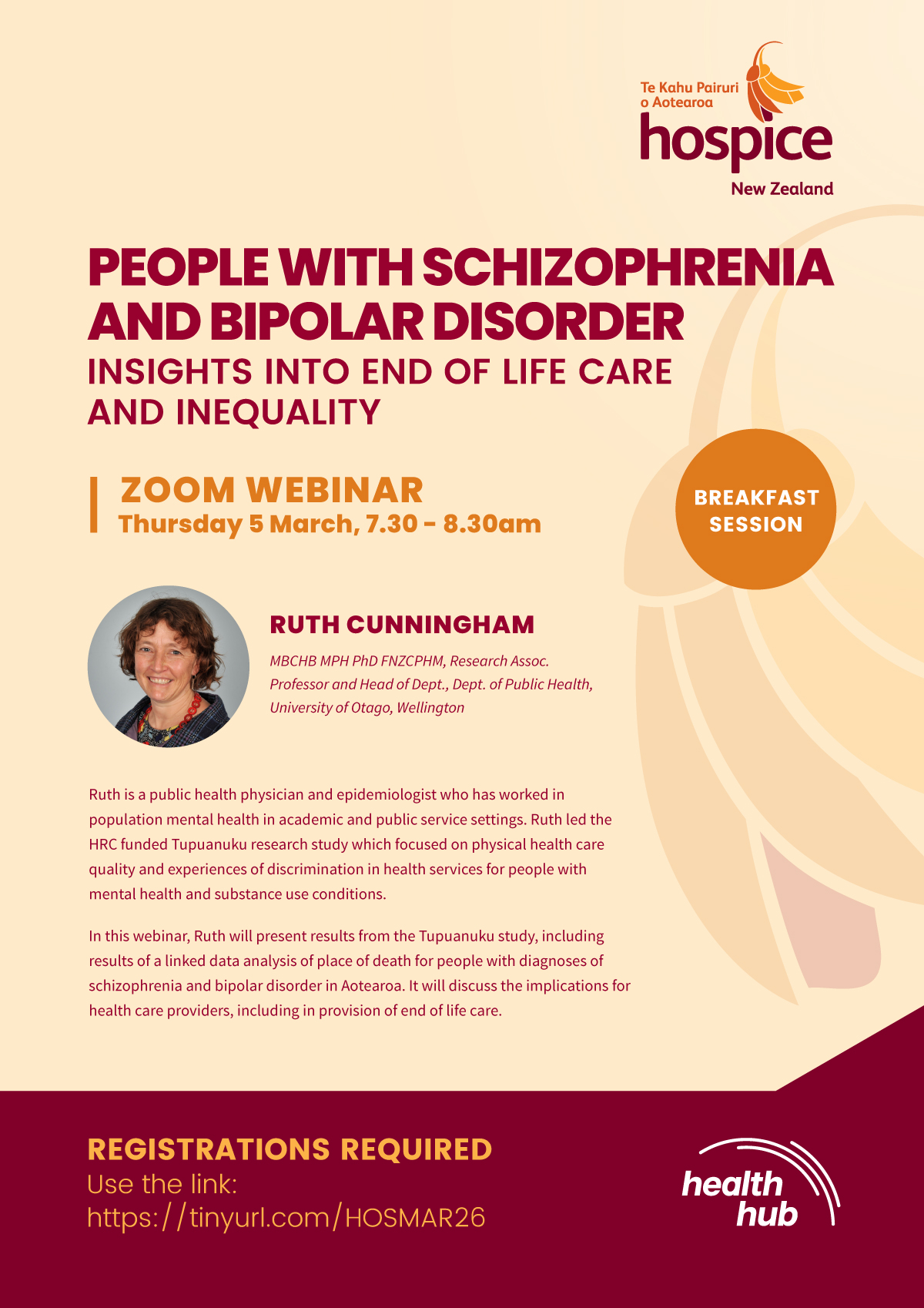 In this webinar, Ruth will present results from the Tupuanuku study, including results of a linked data analysis of place of death for people with diagnoses of schizophrenia and bipolar disorder in Aotearoa. It will discuss the implications for health care providers, including in provision of end of life care.