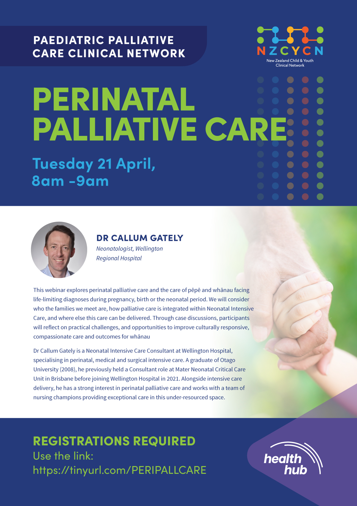 This webinar explores perinatal palliative care and the care of pepe and whanau facing life-limiting diagnoses during pregnancy, birth or the neonatal period. We will consider who the families we meet are, how palliative care is integrated within Neonatal Intensive Care, and where else this care can be delivered. Through case discussions, participants will reflect on practical challenges, and opportunities to improve culturally responsive, compassionate care and outcomes for whānau.